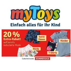 Gutscheincode: SOMMERSALE Kaufen Sie jetzt bereits reduzierte Kleider, Röcke, kurze Hosen und T-Shirts bei myToys.de und erhalten Sie auf diese zusätzlich 20 % Rabatt. Der Gutschein ist für Ihren Online-Einkauf bei myToys.de mit Kundenkonto und nur bis zum 31.07.2019 einlösbar. Nicht auf Partnerartikel anrechenbar. Barauszahlung und nachträgliche Anrechnung ausgeschlossen. Kann mit weiteren % Gutscheincodes kombiniert werden.
