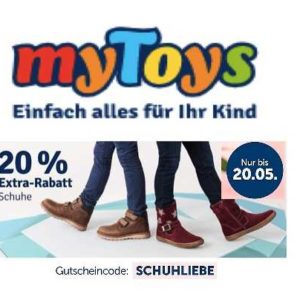 *Gutscheincode: SCHUHLIEBE Kaufen Sie jetzt bei myToys.de Kinderschuhe und Damen- & Herrenschuhe bei mirapodo.de erhalten Sie auf diese zusätzlich 20% Rabatt. Nur bis zum 20.05.2020 einlösbar.