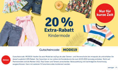 Gutscheincode: MODE19. Kaufen Sie jetzt Mode bei myToys.de oder Damen- und Herrenschuhe bei mirapodo.de und erhalten Sie darauf zusätzlich 20% Rabatt. Der Gutschein ist für Ihren Online-Einkauf bei myToys.de und mirapodo.de mit Kundenkonto und nur bis zum 20.05.2019 einmalig einlösbar. Nicht auf Partnerartikel und die Marken UGG, Paul Green und Tamaris anrechenbar. Barauszahlung und nachträgliche Anrechnung ausgeschlossen. Kann mit weiteren % Gutscheincodes kombiniert werden.