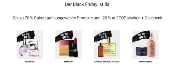 Der OnlineShop Notino bietet euch im Zuge der Black Week auch 20% auf alle Produkte von über 100 ausgewählter Marken im Shop an. Dort bekommt ihr Parfum, Make-Up und noch mehr Beauty-Artikel aus vielen Kategorien. Mit den 20% Rabatt kann schon schon sehr gute Preise erzielen. Schaut euch das mal an: