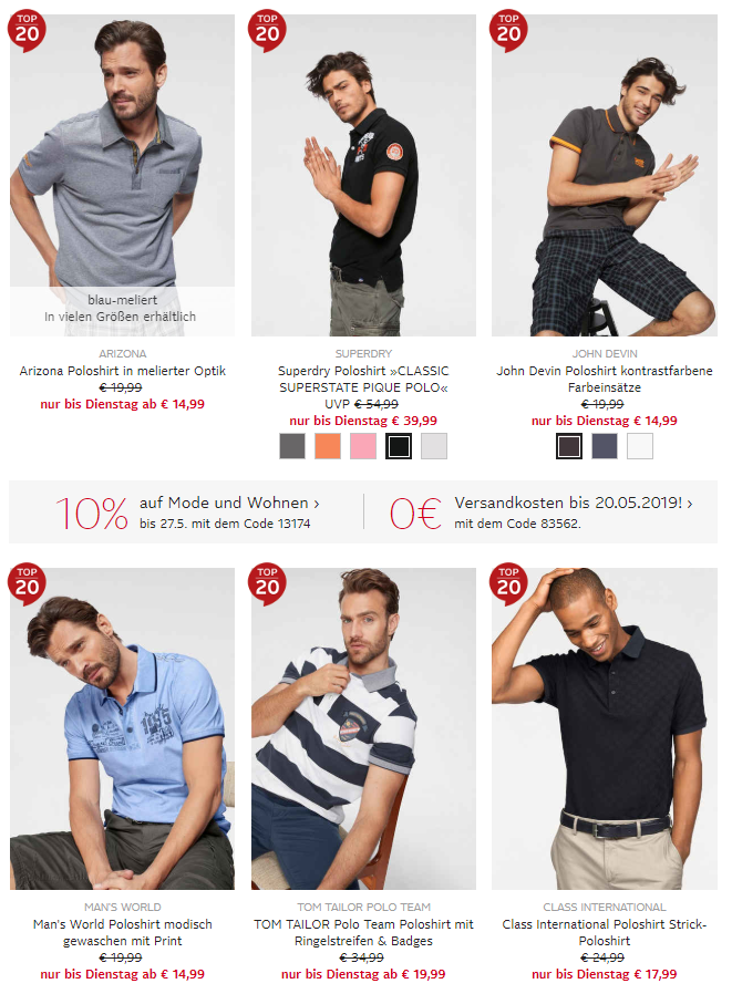 Bei Otto.de könnt Ihr noch bis zum 14.05.2019 einen Rabatt in Höhe von 20% auf ausgewählte Poloshirts erhalten.