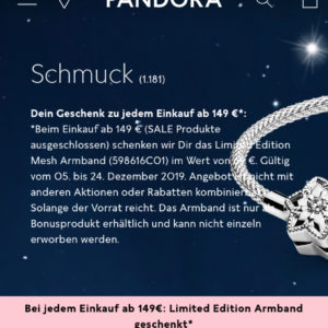*Beim Einkauf ab 149 € (SALE Produkte ausgeschlossen) schenken wir Dir das Limited Edition Mesh Armband (598616C01) im Wert von 69 €. Gültig vom 05. bis 24. Dezember 2019. Angebot ist nicht mit anderen Aktionen oder Rabatten kombinierbar. Solange der Vorrat reicht. Das Armband ist nur als Bonusprodukt erhältlich und kann nicht einzeln erworben werden.