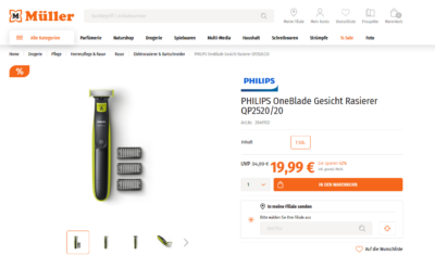 Bei Müller Online bestellen und zum Abholung in der Filiale, bekommt man derzeit die PHILIPS OneBlade Gesicht Rasierer QP2520/20 für 19,99€ statt PVg ab 28€