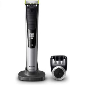 - Lieferumfang: OneBlade Pro Handstück mit digitalem Display (%), Präzisionskamm mit 14 Längeneinstellungen, Ladestation, Reiseetui