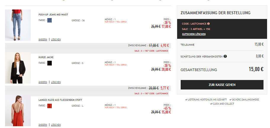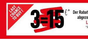 - Zahle 15€ beim zeitgleichen Kauf von 3 SALE Artikeln die mit einem roten Etikett / Punkt markiert sind.