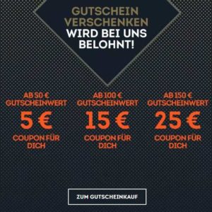 Sportscheck hat jetzt eine Coupon-Aktion für euch: Ihr kauft (zum Verschenken & co) einen Gutschein im Wert von 50€, 100€ oder 150€ und bekommt einen 5€-, 15€, oder 25€-Coupon für euch dazu geschenkt, zum Einlösen bei Sportscheck!