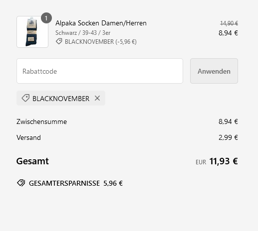 Bei Hausshoes erhaltet ihr derzeit Alpaka Socken (3er-Pack) für 10,74€ zzgl. 2,99€ VersanD – Mit dem Rabattcode: BLACKNOVEMBER bekommt man 40% Rabatt um auf diesen Preis zu kommen. Ab 40€ Bestellwert bekommt man Kostenlosen Versand. Details: