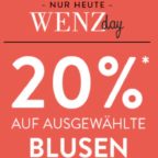 Bei Wenz bekommt ihr nur heute am WENZday 20% Rabatt auf ausgewählte Blusen. Ein Gutscheincode ist nicht notwendig, da die Preise bereits reduziert wurden.