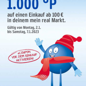 Die Couponbedingungen: Coupon aus dem aktuellen Handzettel abtrennen und mit Ihrer (mobilen) PAYBACK Karte an der Kasse Ihres real Marktes vorlegen ODER vor dem Einkauf online aktivieren auf real.de oder mobil über Ihr Smartphone. Nach Abschluss des Kassiervorgangs vorgelegte Coupons werden nicht mehr berücksichtigt. Der Coupon ist im real Markt mit anderen Coupon-Aktionen auf Warenbereiche kombinierbar, aber nur einmal einlösbar. Die Gutschrift der Punkte erfolgt nach Ihrem Einkauf. Die Gutschrift der Sonderpunkte erfolgt ab einem Mindestumsatz von 100 Euro. Der Coupon ist gültig für die Bepunktung von Artikeln in Haushaltsüblichen Mengen. Gilt nicht für Bücher, Zeitschriften, Zeitungen, Telefonkarten, Geschenkkarten, Pfand, Reparaturen, alle Artikel der Firmen Tchibo/Eduscho und der real Treue-Aktion sowie für Einkäufe beim real Marktplatz.
