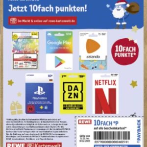 Bis 18.12.22 könnte ihr auf eure Bestellung in der REWE Kartenwelt 10fach Payback Punkte bekommen. Coupon in der App aktivieren und Punkte sammlen.