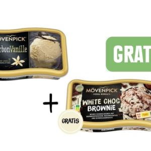 beim Kauf von einer Packung Mövenpick Eis (z.b.Bourbon Vanille oder Salted Caramel) gibt es eine Packung Mövenpick White Chocolate Brownie gratis dazu.
