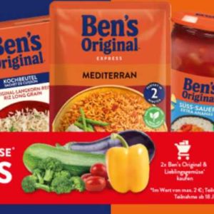 Uncle Ben’s hat aktuell eine Aktion, bei der es beim Kauf von zwei Packungen Ben’s Original™ Reisprodukten Gemüse im Wert von 2€ gegen Einsendung des Kassenbons auf der Aktionsseite erstattet gibt.