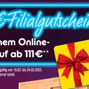 Aktion nur online gültig von 18.02.2023 bis 24.02.2023. 30€ Filial-Gutschein gratis zu jeder Bestellung ab 111€ Bestellwert. Versand des Filial-Gutscheins erfolgt 4 Wochen nach Warenlieferung per Mail. Pro Person maximal ein Filial-Gutschein erhältlich. Nicht mit anderen Aktionen kombinierbar. Der 30€ Filial-Gutschein ist ohne Mindesteinkaufswert auf ALLES einlösbar bis zum 30.06.2023.