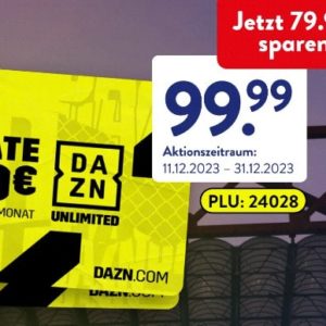 Bei Aldi Süd gibt es nur im Markt einen 4 Monats Gutschein für DAZN Unlimited für nur 99,99€. Das entspricht einem Monatspreis von 24,99€.