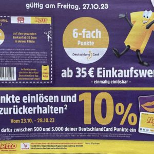 Habt ihr noch mindestens 500 oder mehr Deutschlandcard-Punkte?! Dann könnt ihr diese jetzt vom 23.10. bis 28.10.2023 bei Netto einlösen.