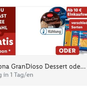 Ab einem Einkaufswert von mindestens 10 € könnt ihr entweder ein Milbona Grandioso Dessert oder eine Packung Combino Nudeln der Sorte eurer Wahl gratis mitnehmen.