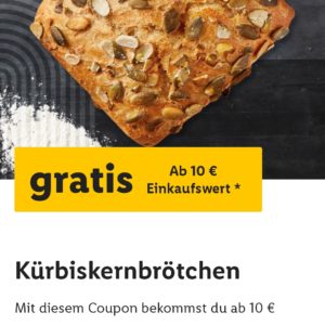 es gibt Mal wieder was gratis mit der Lidl-App – ab 10€ EW. Wenn euer Lidl einen Backshop hat könnt ihr euch ein Kürbiskernbrötchen für lau mitnehmen. Ich weiß, es ist nicht viel – aber besser als nichts!! 😉