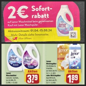 Aktuell bietet Rewe das Lenor Waschmittel für 3,79 Euro & den Weichspüler für 1,89 Euro an.