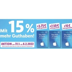 Vom 31.01. – 06.02.2022 bekommt man bei Lidl (offline) 15% Bonus Guthaben auf iTunes Karten: