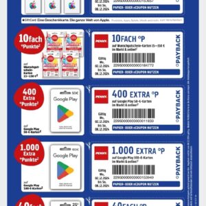 Payback Punkte satt: 20fach auf Apple, 10fach auf Wunschgutscheine und jede Menge Extrapunkte auf Google Play Cards