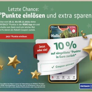 * Du erhältst den Rabatt-Coupon bei Umwandlung von PAYBACK °Punkten in REWE Einkaufsguthaben in der App oder im Kundenkonto. Aktion gilt nur vom 18.11. bis 08.12.2024. Weitere Informationen unter rewe.de/10zurück