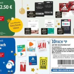 Daneben gibt es im gleichen Zeitraum noch 10Fach Punkte auf fast alle Geschenkkarten. Ausgenommen hiervon sind die Rewe Geschenkkarten, sowie Mobilfunk- und Paysafe-Karten. Zum Erhalt der Punkte muss der entsprechende Ecoupon im Kundenkonto aktiviert werden, oder der Papiercoupon an der Kasse vorgezeigt werden.
