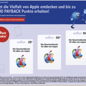 Bei REWE bekommt ihr vom 14.10. bis 20.10.24 auf Apple Geschenkkarten 20- fach Punkte , also 10% Rabatt …