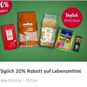 Ab dem 30.09.2024 bis 01.11.2024 erhaltet ihr mit der Rossmann App täglich 20% Rabatt auf alle Lebensmittel.*