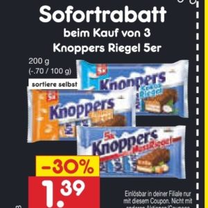 Im Netto Markendiscount gibt’s ein Coupon für 3× 5er packet knoppers Riegel und man bekommt 1€ Rabatt wenn man die 3 Packungen nimmt