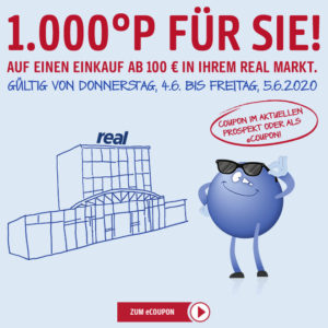 Coupon aus dem aktuellen Handzettel abtrennen und mit Ihrer (mobilen) PAYBACK Karte an der Kasse Ihres real Marktes vorlegen ODER vor dem Einkauf online aktivieren auf real.de oder mobil über Ihr Smartphone. Nach Abschluss des Kassiervorgangs vorgelegte Coupons werden nicht mehr berücksichtigt. Der Coupon ist im real Markt mit anderen Coupon-Aktionen auf Warenbereiche kombinierbar, aber nur einmal einlösbar. Die Gutschrift der Punkte erfolgt nach Ihrem Einkauf. Die Gutschrift der Sonderpunkte erfolgt ab einem Mindestumsatz von 100 Euro. Der Coupon ist gültig für die Bepunktung von Artikeln in Haushaltsüblichen Mengen. Gilt nicht für Tabakwaren, Bücher, Zeitschriften, Zeitungen, Telefonkarten, Geschenkkarten, Pfand, Reparaturen, alle Artikel der Firmen Tchibo/Eduscho und der real Treue-Aktion sowie für Einkäufe beim real Marktplatz.