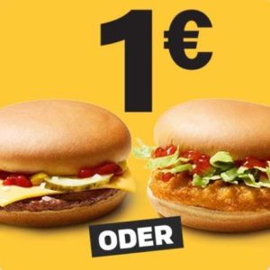 1 Burger nach Wahl für 1€ für Cheeseburger (statt 1,39€) & Chickenburger (statt 1,39€) bei McDonald’s