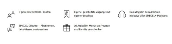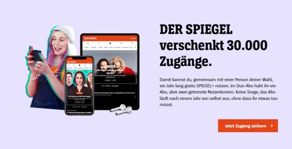 Ihr erhaltet ihr das Duo-Abo von Spiegel+ kostenlos. Das bedeutet, ihr habt ein Abo, aber zwei Nutzerkonten. Eins davon könnt ihr ja jemandem geben, damit er auch Zugriff auf das Abo hat. Laut Beschreibung geht das aber nur fĂŒr Leute, die im selben Haushalt wohnen.