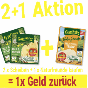 Wer regelmäßig zu Grünländer greift, kann sich mit dieser Aktion ganz unkompliziert einen Preisvorteil sichern. Beim Kauf ausgewählter Grünländer-Käse wird ein Teil des Einkaufs erstattet. Voraussetzung ist der Kauf der festgelegten Produktkombination innerhalb des Aktionszeitraums. Alle Sorten der genannten Produkte sind teilnahmeberechtigt.