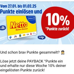 Vom 27.01. bis 01.02.2025 könnt ihr bei Netto MD eure Paybackpunkte beim Bezahlen einlösen und erhaltet 10% der eingelösten Punkte zurück.