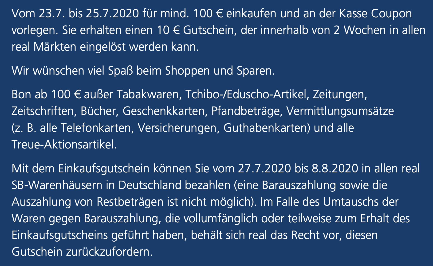 Mit dem Einkaufsgutschein können Sie vom 8.2.2021 bis 20.2.2021 in allen real SB-Warenhäusern in Deutschland bezahlen (eine Barauszahlung sowie die Auszahlung von Restbeträgen ist nicht möglich). Im Falle des Umtauschs der Waren gegen Barauszahlung, die vollumfänglich oder teilweise zum Erhalt des Einkaufsgutscheins geführt haben, behält sich real das Recht vor, diesen Gutschein zurückzufordern.