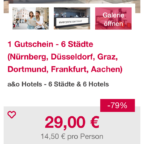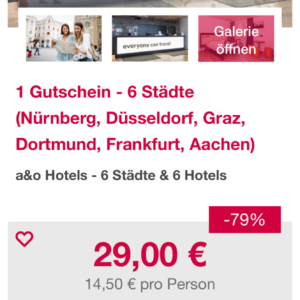 Es gibt wieder lukrative Übernachtungsgutscheine für verschiedene a&o-Hostel für 2 Übernachtungen für 2Personen für nur 29 Euro im Doppelzimmer. Frühstück ist nicht dabei. Zur Auswahl stehen mit dem Gutschein Unterkünfte in 6 Städten, nämlich in Nürnberg, Düsseldorf, Graz, Dortmund, Frankfurt, Aachen.