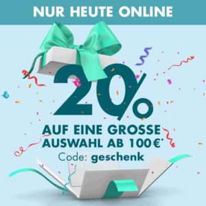 Bedingungen: Heute bis 24 Uhr und nur online 20 % ab einem Einkaufswert von 100 € sichern. Einfach im Warenkorb den Aktionscode geschenk eingeben und der Nachlass wird abgezogen. Gültig auf GALERIA.de für Produkte ausgewiesen mit „verkauft durch GALERIA“. Nicht nachträglich für bereits gekaufte Ware und nicht in Verbindung mit anderen Rabattaktionen und Aktionscodes einsetzbar. Nicht gültig für Geschenk-/ Guthabenkarten, Bücher, Zeitschriften, Services, Lebensmittel, Reisen, Elektrogeräte, Matratzen, Wein, Spirituosen, Multimedia, Spielzeug, Spielekonsolen, Videospiele, E-Scooter und folgende Marken: galeria.de/prozent-ausschluss. Bei Damenbekleidung und Acc. erhalten Sie 30% Nachlass ohne Mindestbestellwert.galeria.de/prozent-ausschluss.