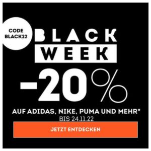 *Gilt nur für gekennzeichnete Artikel der Marken Adidas, Nike, Puma, Gore, Under Armour und Vaude. Gültig vom 17.11. bis 24.11.2022 auf sportscheck.com (im Schritt „Prüfen und Bestellen“ Couponcode BLACK22 angeben). Ausgenommen Artikel mit Direktversand durch Partner. Nicht mit anderen Sonder- und Rabattaktionen kombinierbar. Keine Barauszahlung. Eine nachträgliche Gutschrift des Aktionsgutscheins auf eine abgeschlossene Bestellung ist nicht möglich. Nicht einlösbar in den SportScheck-Filialen, Outlets, beim Kauf von Geschenkgutscheinen und bei Event-Anmeldungen.