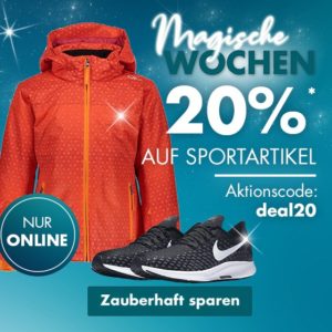 Bedingungen: Magische Wochen: Heute und nur online 20% auf Sportartikel sichern. Einfach im Warenkorb den Aktionscode deal20 eingeben und der Nachlass wird abgezogen. Gültig auf GALERIA.de für Produkte ausgewiesen mit „verkauft durch Karstadt“. Nicht nachträglich für bereits gekaufte Ware und nicht in Verbindung mit anderen Aktionsvorteilen einsetzbar. Kein Nachlass auf Fahrräder.