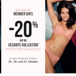 Bedingungen: Rabatt gilt nicht auf die Doutzen’s Stories Kollektion. Der Memberday Rabatt ist online und in den Filialen gültig ab Freitag, den 25. Oktober bis Sonntag, den 27. Oktober 2019. Nicht in Verbindung mit anderen Aktionen.