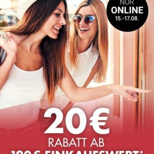 Bedingungen: Der Rabatt wird automatisch im Warenkorb abgezogen. DIe Aktion ist nur online bei kaufhof.de und nur für kurze Zeit vom 15.08. bis einschließlich 17.08.2019 gültig. Die Aktion ist nicht mit anderen Rabattaktionen kombinierbar. Ausgeschlossen sind Spielwaren, Lebensmittel und Kleinelektro sowie folgende Marken (kaufhof.de/svp/).