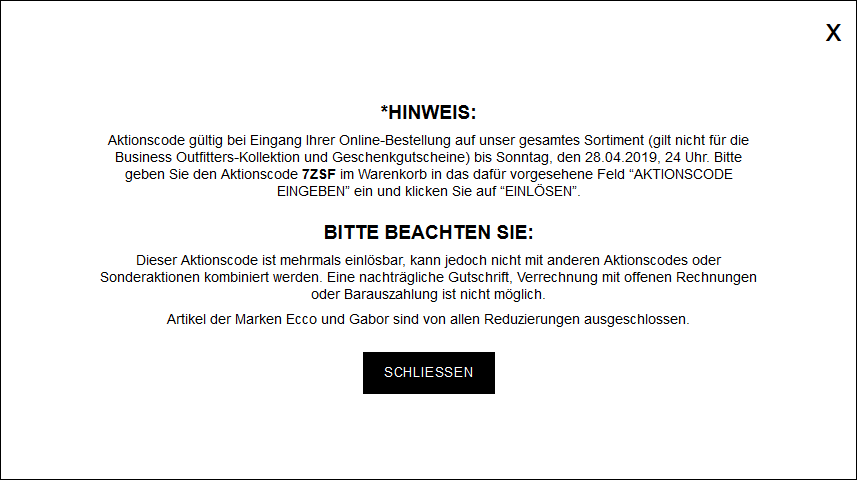 Bedingungen: Aktionscode gültig bei Eingang Ihrer Online-Bestellung auf unser gesamtes Sortiment (gilt nicht für die Business Outfitters-Kollektion und Geschenkgutscheine) bis Montag, den 28.04.2019, 24 Uhr. Bitte geben Sie den Aktionscode X25Z im Warenkorb in das dafür vorgesehene Feld “AKTIONSCODE EINGEBEN” ein und klicken Sie auf “EINLÖSEN”.