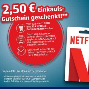 Bei Aldi-Süd bekommt man 2,50€ Einkaufsgutschein geschenkt für 25€ Netflix Guthaben 09.11. bis zum 14.11