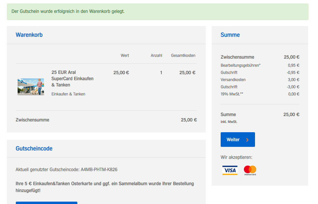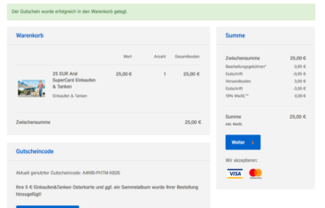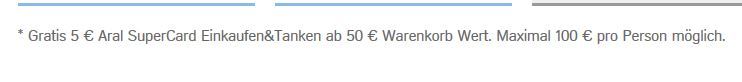 *Zitat Aktionsseite: * Gratis 5 € Aral SuperCard Einkaufen&Tanken ab 50 € Warenkorb Wert. Maximal 100 € pro Person möglich.