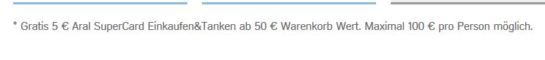Gratis 5 € Aral SuperCard Einkaufen&Tanken ab 50 € Warenkorb Wert. Maximal 100 € pro Person möglich