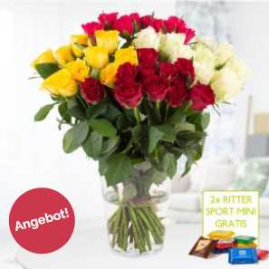 Unser Rosenstrauß 40 bunte Rosen besteht aus weißen, roten, gelben und rosafarbenen wunderschönen Rosen. Dieser fröhliche Blumenstrauß ist das ideale Geschenk für einen besonderen Menschen, denn die Rose ist die beliebteste Blume weltweit. Unser Tipp: Ein paar persönliche Worte in der kostenlosen Grußkarte machen aus diesen Rosen das perfekte Geschenk. Die Stiellänge der Rosen beträgt ca. 40 cm. Zwei gratis Ritter Sport Minis werden der Lieferung beigelegt.