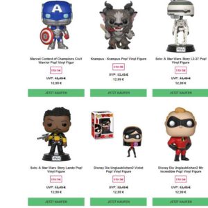 Bei zavvi könnt ihr euch 5 ausgewählte Funko Pop Figuren für 34€ plus 1,49€ Versandkosten holen. Das macht 7,10€ pro Figur. Die Preise der Figuren sind ansonsten bei anderen Anbietern sehr unterschiedlich. Die Meisten kosten aber dennoch mehr als der Einzelpreis, welcher hier erreicht wird.