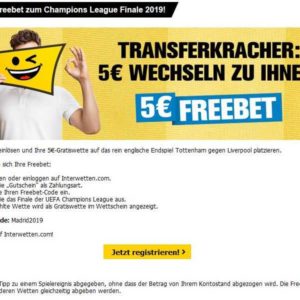 Zum CL Finale in Madrid spendiert Interwetten euch mit dem Code „Madrid2019“ eine 5€ Freebet. Diese kann nur auf jenes Event angewandt werden.