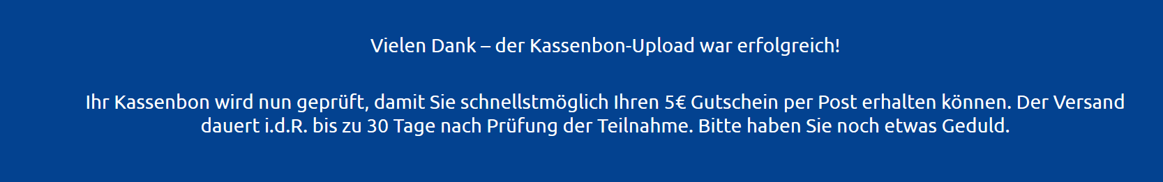 Ihre Teilnahme war erfolgreich! Wir senden wir Ihnen in den nächsten ca. 30 Werktagen einen Einkaufsgutschein per Post. Bitte haben Sie dafür noch etwas Geduld und sehen Sie solange von Rückfragen ab.