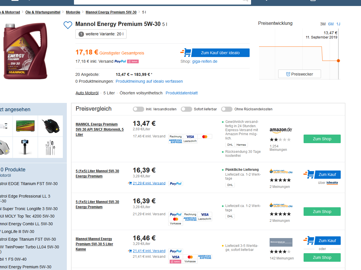 Bei Amazon bekommt ihr MANNOL Energy Premium 5W-30 API SN/CF Motorenöl, 5 Liter für 13,47 statt PVG ab 21,29 Euro mit prime Versand Kostenlos.
